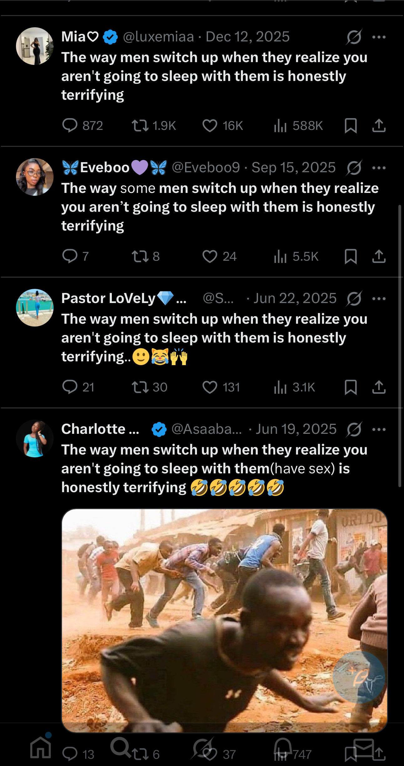 >reposting engagement bait from Nigerian blue checkmark accounts to spam another "Chad took my foid" thread You're all cattle honestly
