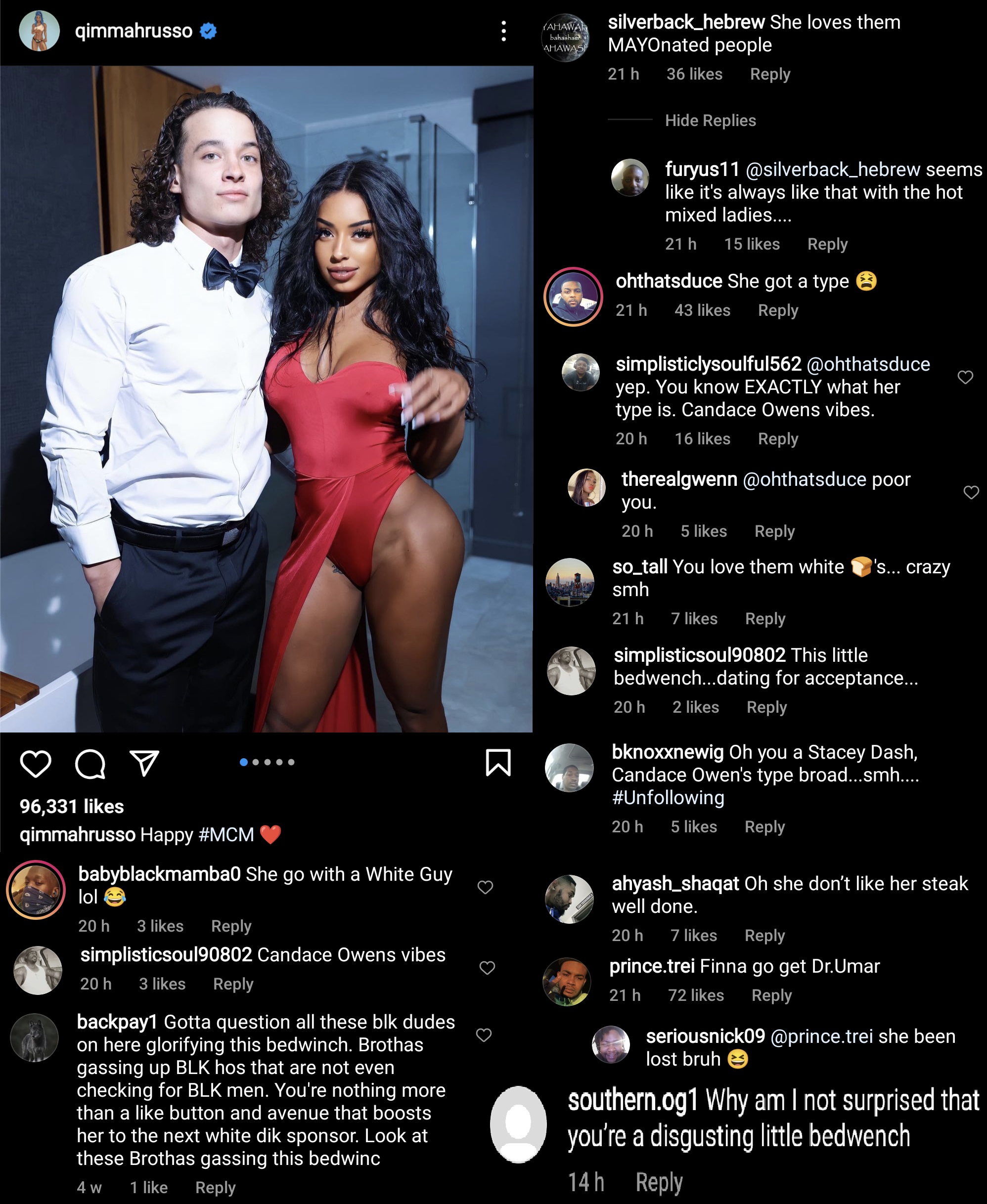 >>84258426Tariq Nasheed calls black women who date whites "bed wenches" and I have seen some some other black guys say that too.
