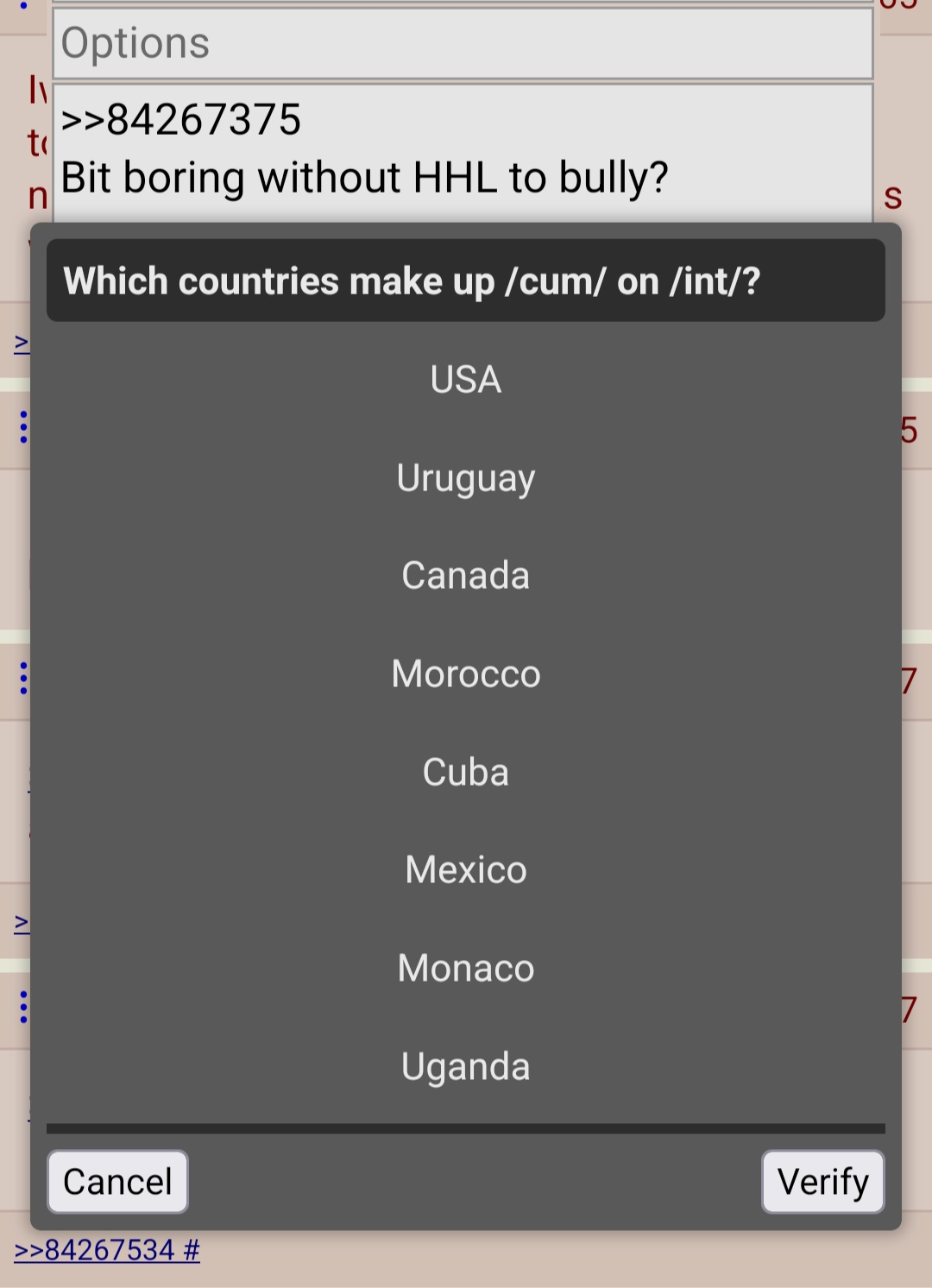>>84268082It's to see if you know about the culture and site.Won't just be that, there'll be some punishment for not knowing.