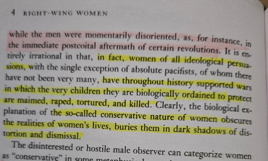 >>84264850>In fact, women of all ideological persuasions, with the single exception of pacifists, of whom there have not been very many, have throughout history supported wars in which the very children they are biologically ordained to protect are maimed, raped, tortured and killed.This is from Andrea Dworkin "Right-Wing women". She says that it's a mere myth that women are naturally protective of their own children.See also: circumcision. (they will fucking mutilate their own children)