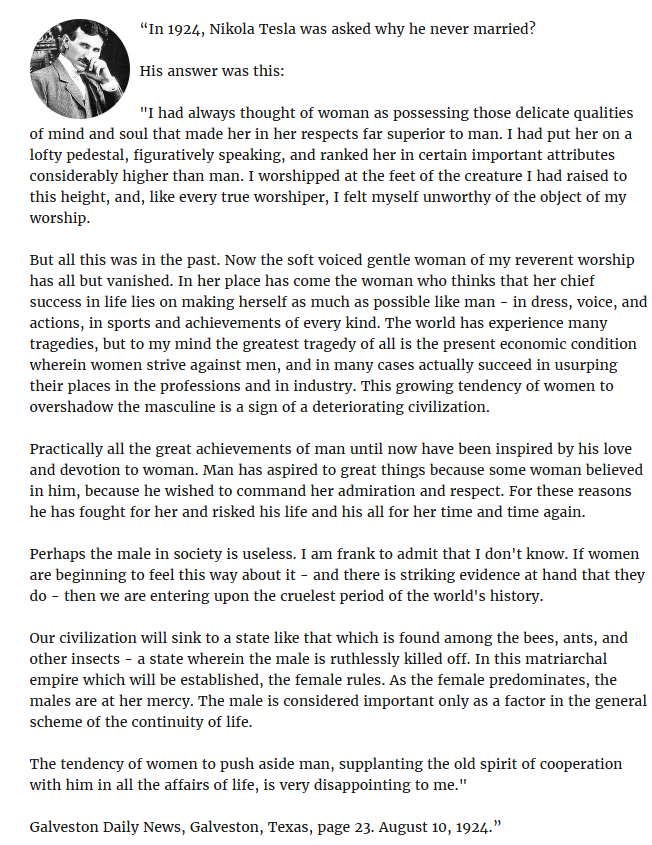 Tesla who was an avid simp in his youth, changed his mind later on and believed that women will make an attempt at exterminating males as soon as they have any chance of pulling it off.