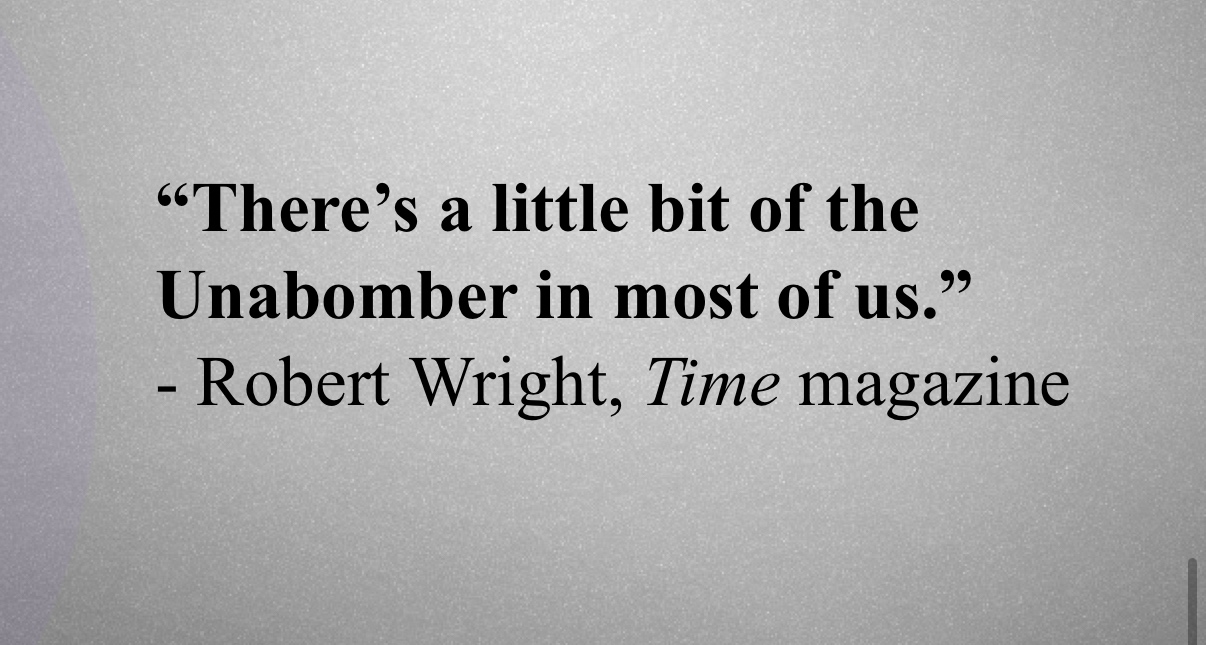 >>84264807>Could you fucking imagine Ted Kaczynskis Manifesto having praising blurbs by major newspapers?!?!?!?!i thought it was hilarious to end a college presentation on the unabomber with this, actually.