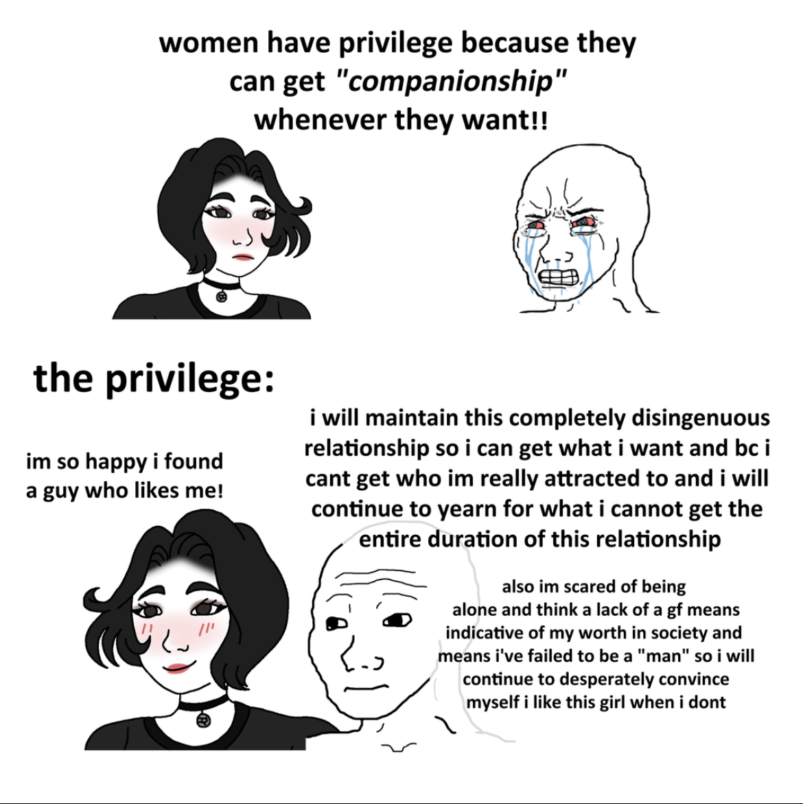 >>84284359>if you were actually a humanYeah, no. I'm glad your disgusted by men.>people crave love and to be lovedI know this. I just don't get why women don't use their power over men to get love.>cheating undermines someones sense of being worthy of love at all and brings instability into other relationships. Yes, but he wouldn't have cheated if he loved her. Also, you know what undermines someone's sense of being worthy of love even more than cheating? Being rejected by everyone. Never having even pretend love in the first place. If I got into a relationship and then got cheated on, it hurts, but at the very least I was worth the time of day to someone to get to know me at all.>its not my fault that society works in my favour, i cant relininquish it. Oh, that's rich. It's not your fault, no. But it would be nice and smart if you tried to use that favor to get healthy relationships rather than Chad.>if all men thought like you thered be no point in dating. You're right. If everyone thought like me, dating would be pointless because we'd all just be in relationships together.>submissive men think this way as well lmfao my ex e bf wanted me to put him in a chastity cage as well and i indulged and he was still a cheating little whore, it's your biologyHow tf did he cheat lol? What did he do, finger her? If a woman comes upon a masculine looking man, gets in bed with him and finds out he's wearing a chastity cage, you really think she's not gonna get the ick?Further, what did you do to him to make you seem like anything more than a sex object? If you just locked him up in a cage and that's it, he's not gonna care about you. You have to hurt him. Make him feel something besides horny. If the whole femdom shit gives you the ick, then do something really hard with him that he can't back out of the moment his horniness wares off, like drugs or a thru hike or a job or something. You have to bond together somehow.
