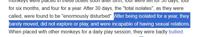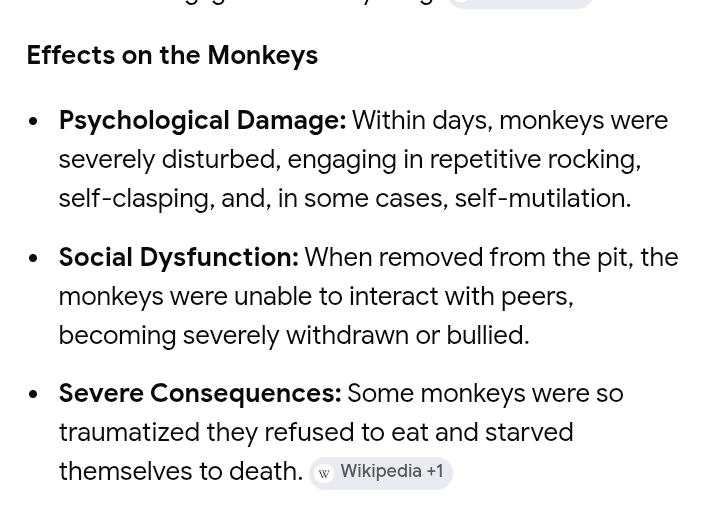 it's not that bad, for instance we're talking together and surely most of us aren't bots. you also have your family as well. so you dont have friends or a gf but a lot of us have their family. if you dont have a family you have online forums where you chat with people. otherwise you have fake friends in streamers or youtube videos which are better than some wire that dispenses heat or whatever. it's more like bladerunner AI girlfriend than harlow shit.