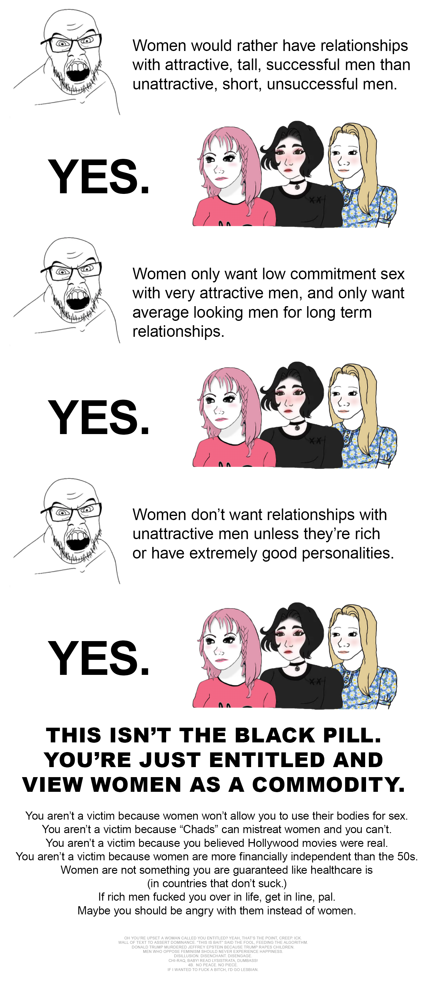 >>84290573>Newsflash, buddy: freedom of speech doesn't suddenly stop when women start talking. It includes their opinions just as much as yours, whether you like it or not. You don't get to wave that principle around and then ignore it when it's inconvenient.Nta, but it's spam at this point. Shitposting/spam here is fine. He's just whining. We've had worse phases on /r9k/ than feminazi eugenics spam kek.>>84290923>Dude, just respect women's rights. It's not that hard.Why should I respect women's rights when they actively use their rights to enforce patriarchal male roles that end up oppressing both genders and then nobody gets to have rights that are respected.Like, say I did what OP was saying and I became the amitious patriarch she and every "strong woman" desires? Then I lead her life and deprive her of rights by the nature of leading, and then I fuck every woman possible because that's what it means to be an ambitious man. She'll never be enough. And then I also push other men down because I'm ambitious, and it's not enough. I'm a man. I'm insatiable. I'm actually on women's side, here. I want them to keep their rights. They apparently just want the right to throw their rights away, though.
