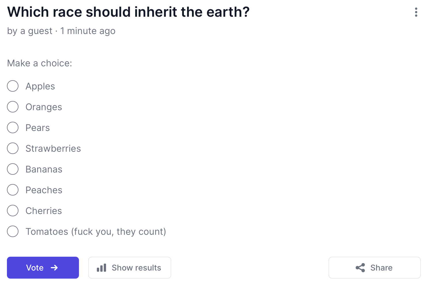 >>84292160I was going to vote tomato, but you felt the need to justify it's existence, setting it up for ridicule