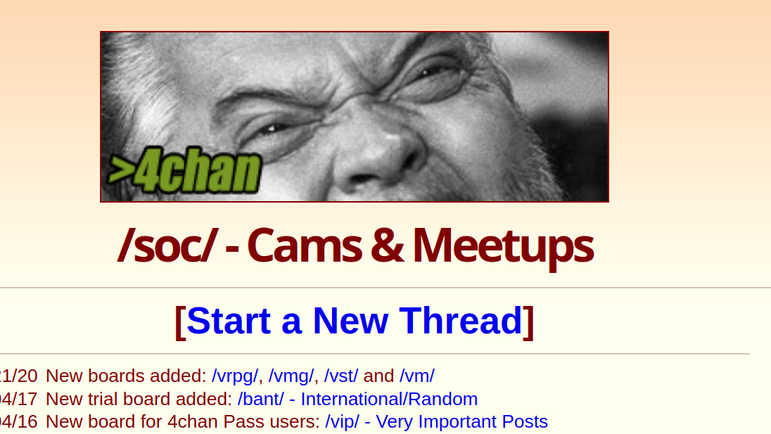 >why is that board up?it's a containment board to keep contactfagging and camwhoring off of /r9k/ which was, at the time, the main general board. /r9k/ kept having civil wars over the normies posting their selfies and info to hookup and the robots who wanted to stay anon. both sides despised each other. many threads were destroyed and the board was vandalized by both factions over and over to declare it THEIR board. /soc/ was made to segregate the two.