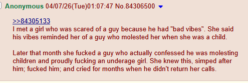 >>84309962Why do men with history of child sexual abuse have more success with women than men with 0 history of rape?