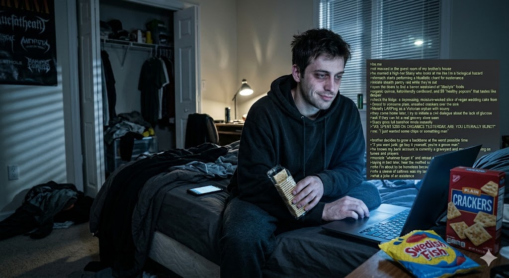 >be me>temporarily living with my younger brother and his stacy wife>feeling kind of snackish>initiate pantry raid>besides oreos, knockoff swedish fish, and twizzlers and "healthy popcorn" they have literally nothing>soggy half eaten cake in the fridge>literally end up snacking on plain salted crackers like i'm a fucking 1500s peasant or something>later that night when they're both home ask if they can go grocery shopping or something>before brother even says anything his wife starts screeching>"WE LITERALLY JUUUUSSSTT WENT GROCERY SHOPPING, WHAT DO YOU EVEN WANT?">keep my cool and say i just wanted some snacks or something>now brother pipes up and asks why i didn't go myself earlier>he knows i have no money for snacks, barely even any money for gas>say "whatever it's fine just fuck off" and leave the dining area>hear them arguing last night quietlygreat now she's gonna make him fucking kick me out. all because i wanted some snacks. what a fucking joke of a life.