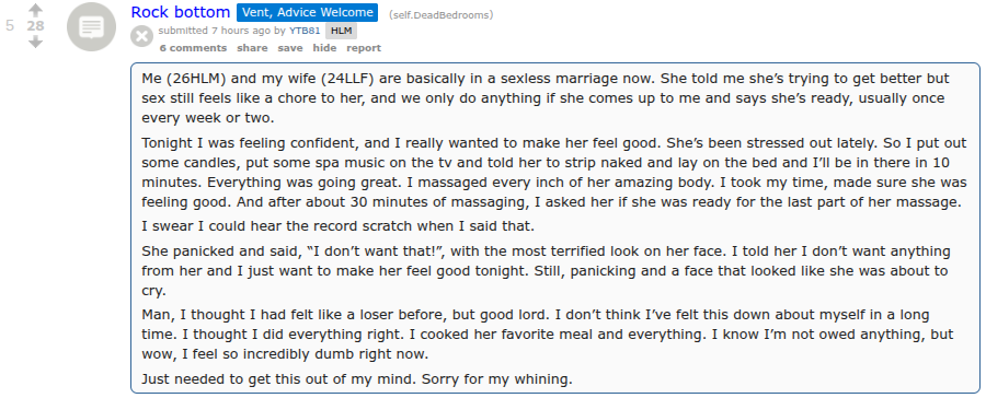 >>84323240I was looking at that subreddit recently, and apparently, they have a rule against saying, "I feel like my partner and I are just roommates." They also have rules against saying things like, "I think I was just a secure option for them, and they married me for my assets." And if anyone ever posts about how it's been 5 years since their kid was born and their wife still doesn't want to have sex, they'll leave a comment that's an essay that can be summarized as "Erm, actually it's normal for women to not want to have sex for half a decade after having a kid." The people who manage that place are very harsh towards the typically higher libido people who make up the majority of the posters.