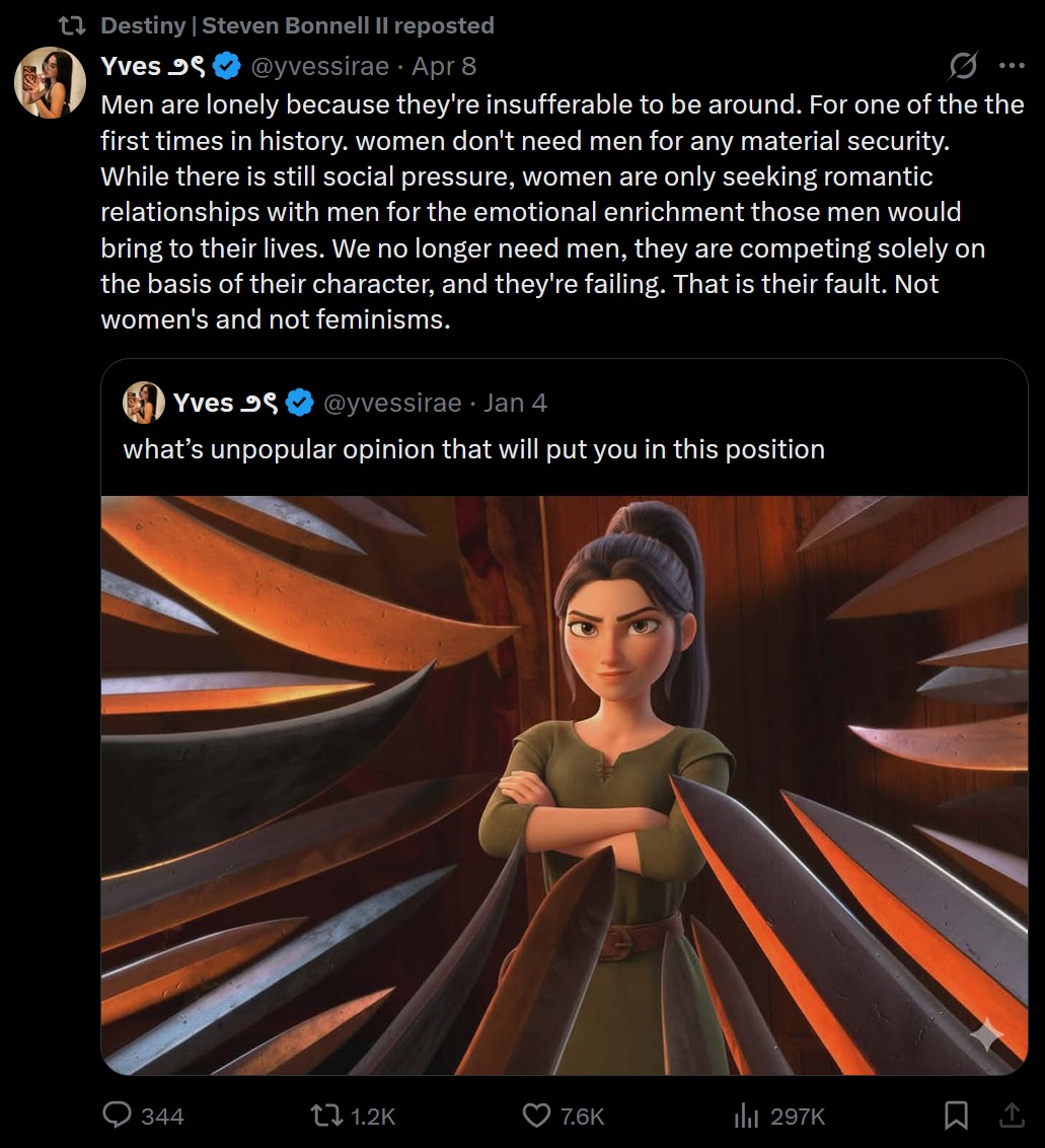 And yet this has been the status quo for many decades. And this only started arising with the rise of social media? Something doesn't add up here. Feminist peddle this misandrist narrative that men are in general so fucking awful that when a woman doesn't need a man economically, she doesn't associate with them. But I just don't understand what this view is based on. There have been so many things that have changed in the XXIst century, like for example the rise of social media technology, which had a profound impact on the way people socialize, and yet you just hyper-focus on this other non-discriminating variable, because it serves your hateful agenda.