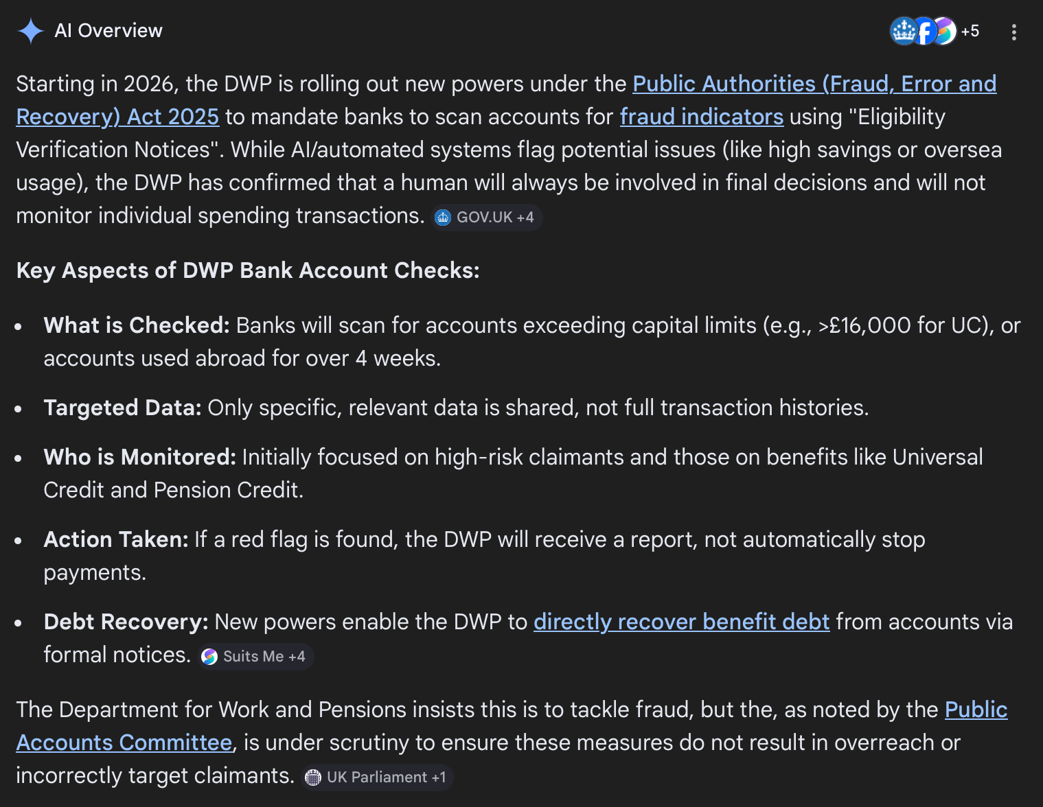 >>84338647They find out when they do the UC reviews or when this new AI bank account searcher comes into place sometime this year. I imagine the program has the ability to scan through millions of bank accounts to check if the savings limit is being reached. This new thing will bring fraud to a screeching halt allegedly.