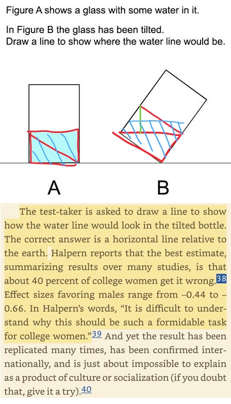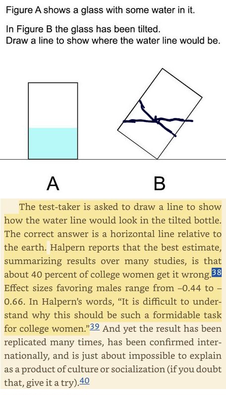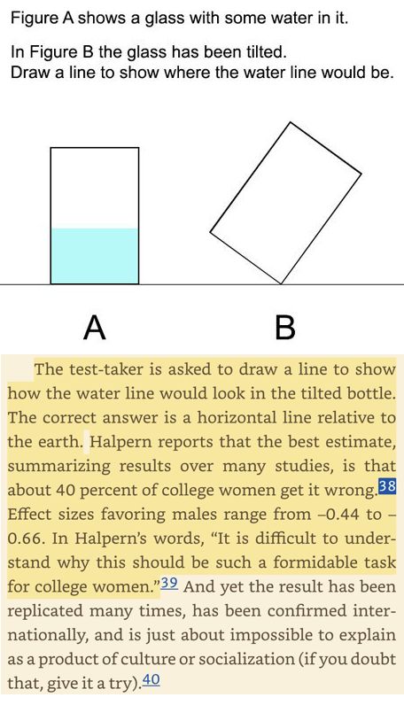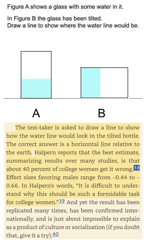 But women apparently can't visualize water in a tilted glass.