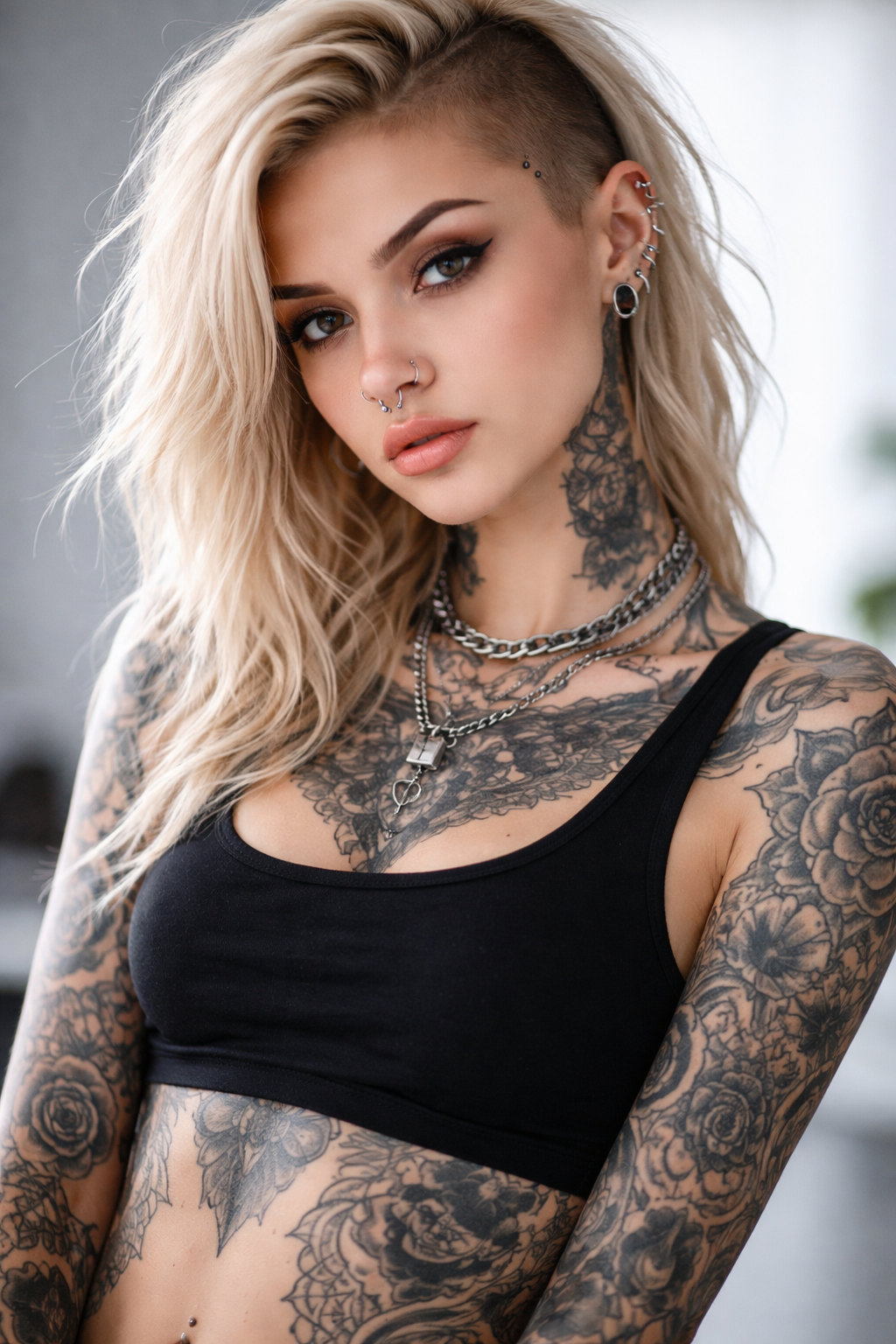 >Elaborate tats all over her body, bleached blond hair shaved on one side, piercings everywhere