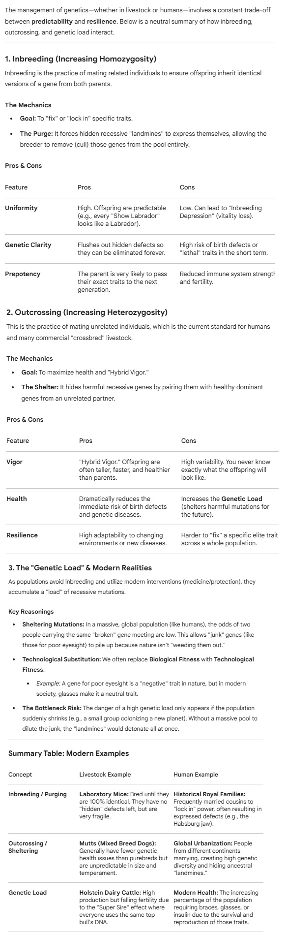 I was bored enough to search through some papers about this stuff and using ai to make them more digestible. There are a few interesting points, first off our extreme lack of inbreeding in modern society combined with low natural selection is rapidly filling our genetics with landmines, we really need to get to genetic editing technology before we get to the point of genetic trash saturation where our chances of accidentally activating bad recessives gets worse than asian eyesight genetics.