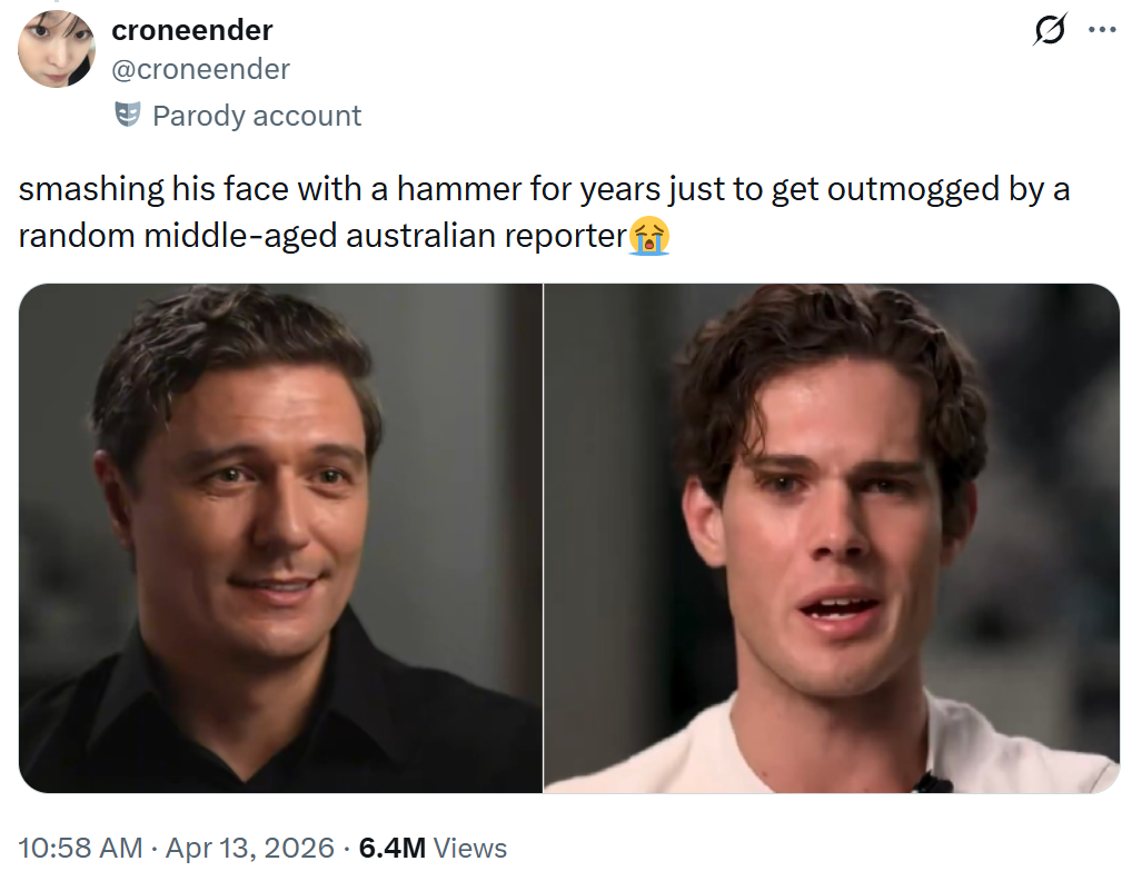 >>84367003>comparing a picture one guy with his mouth open while talking and another guy with his mouth closed and smilingyeah sure haha this middle aged reporter totally mogsyou should not listen to looksmaxxers because this looksmaxxer got mogged by a reporter! (he didn't) Also this totally disproves his worldview when I use his own worldview to argue why he lost