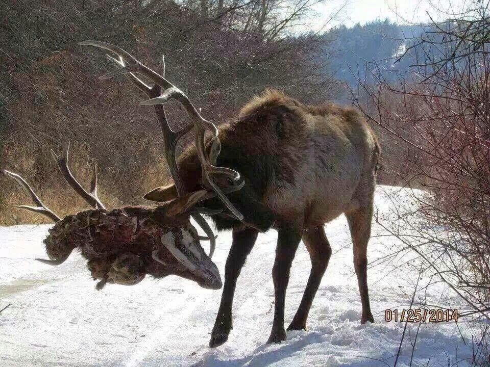 >>84371831Not a moose. I believe it's an elk. A bull elk might compete with a rival bull for territory or for mating rights, or something. Anyway, it can be something where they end up fighting and sparring with their antlers not unlike smaller types of deer.. however, perhaps unfortunately a bull elk's antler rack can grow to be really quite spectacular. it's not unheard of for one to get it's antlers stuck in wire, or get injured from antler sparring for that matter. i imagine there's been a few that have died simply because they were dragging around a former rival.