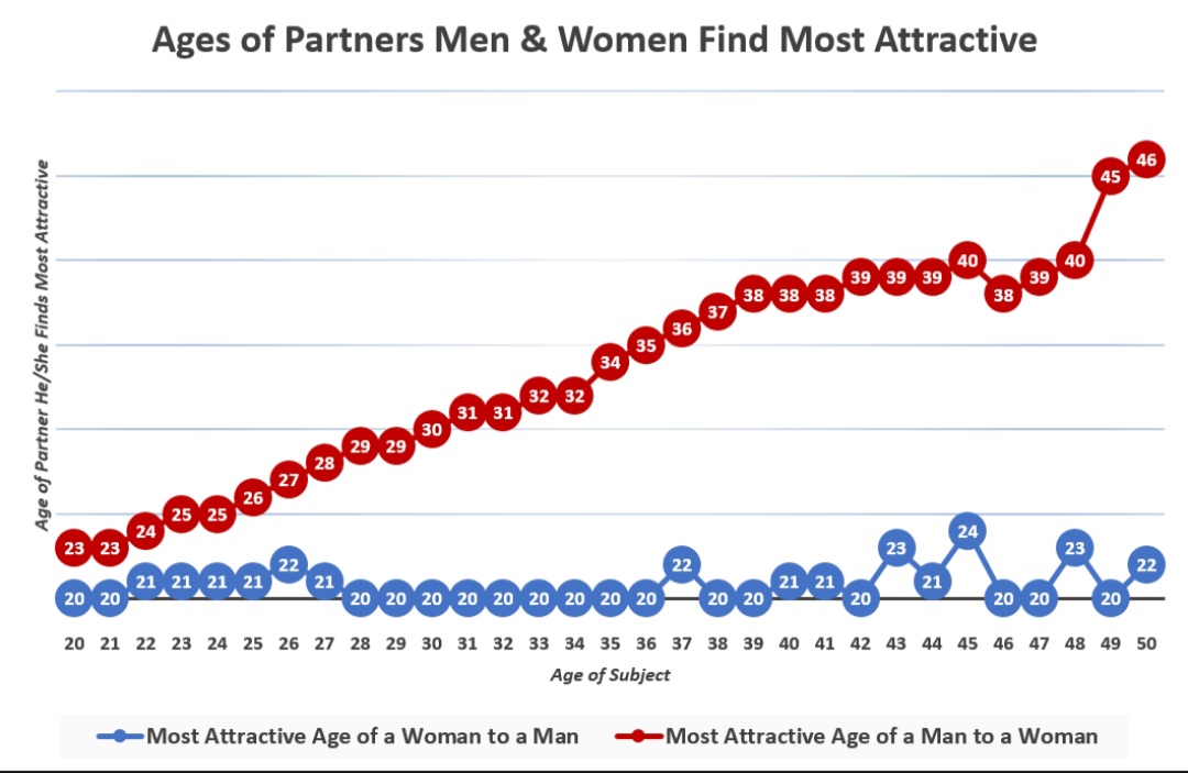 The chart represents who they find *most* attractive, I often see women in their 30s and sometimes 40s and 50s more attractive than some run of the mill fat manjawed obnoxious 20 year old. However these women with attractive features who take care of themselves were probably more attractive when they were 20. Aging changes many of the features men find attractive, clear smooth wrinkle free skin, pert breasts, round posterior, slender waist, the "hour glass" figure, little deformation of her body due to fat or bad posture over the years.Women look for an overall "hunk" physique, broad shoulders, square jaw, lanky limbs and torso, they care less about the details like a man's rough hairy skin, after that there is also personality, it is not enough to be physically attractive they need "confidence" and the like.My advice to women is to ignore all the nonsense on social media and just focus on being healthy, your beauty will come out naturally after that. Whether it be """feminists""" pushing "fat acceptance" or Chuds judging your "cellulite", you are receiving some very bad advice. Instead listen to wholesome enlightened antisocial media like 4chan. We are not an echo chamber, we love criticism and after years we are more refined, we are all literal geniuses who know better than everyone else.