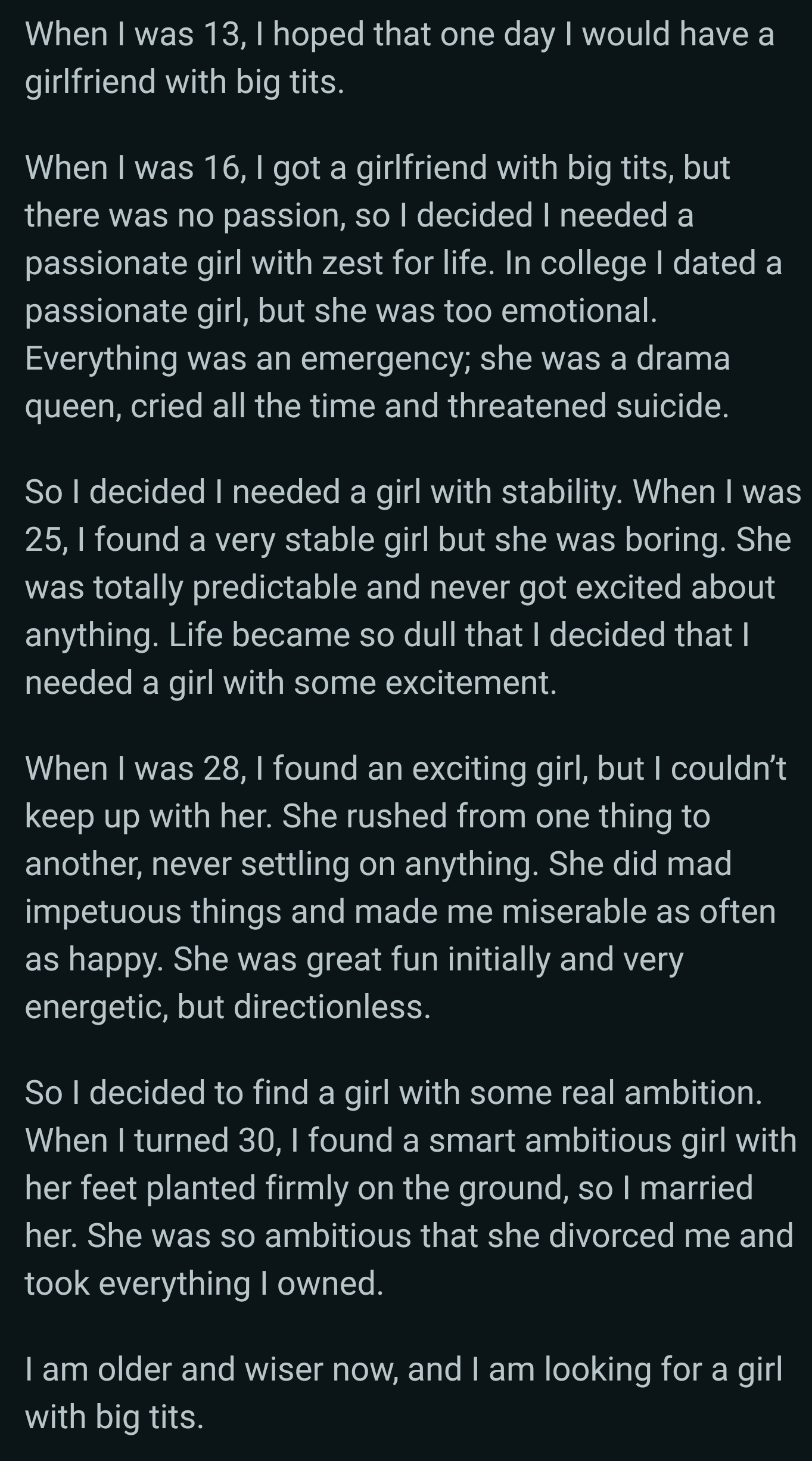 >>84374873yeah, men are shit and retarded so they only see a partner in terms of fucking, that's why they believe the wall for a woman is at like 20 years old.Women just have a superior understanding of what things like life and love actually are.