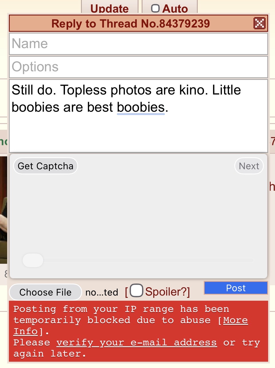 >>84379214hope they're not bringing that shite back again. there was about a year where 4chan basically wasn't an IMAGEboard any more.i was getting these again the other day when the site was shitting the bed, but it's fine again now (don't think my IP address has changed). assumed it was just their way of slowing traffic for a bit, tbqh.