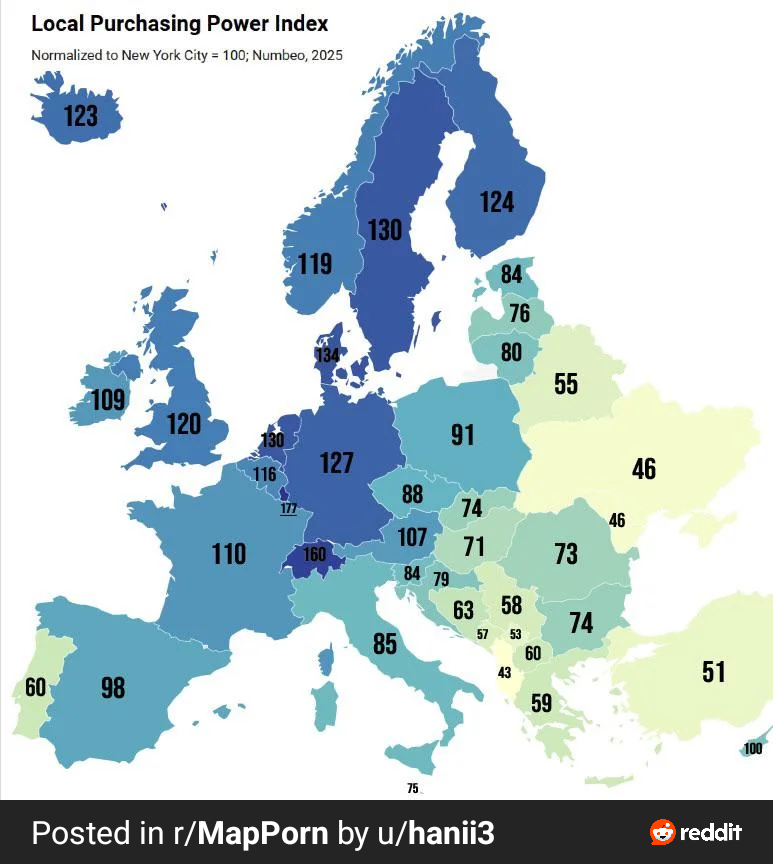 >>84385317> our millionaires earn more than yours! Try comparing purchasing capacity, goy. Half of Europe has it miles higher than the richest city in America. Interestingly you can't even properly find data on purchasing indexes in states. You are not allowed this info because it may as well break the hegemon.