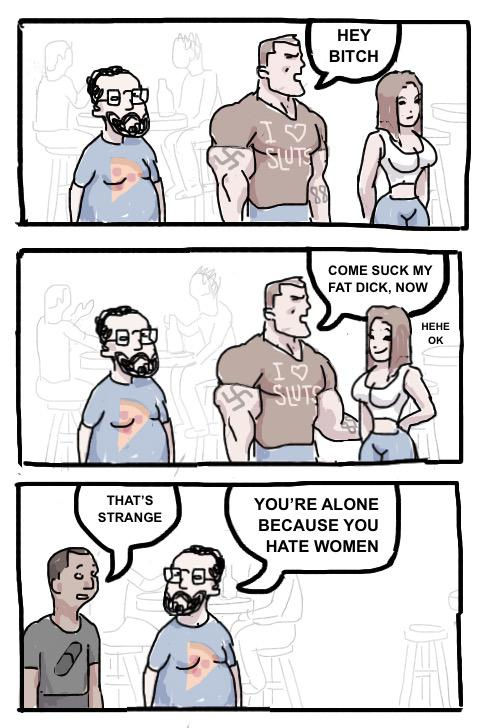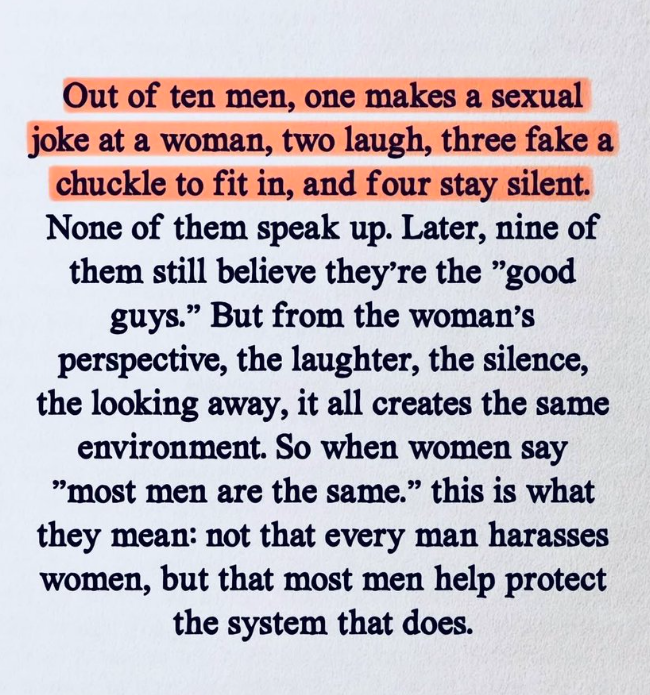 i would be 100% fine with this if women didn't repeatedly, overwhelmingly reward the one out of ten men in that scenario who makes the joke, or even ex rapists, wife beaters, serial cheaters etc and say that men who stick up for them give them the 'ick' , dry them up, are simps etc.