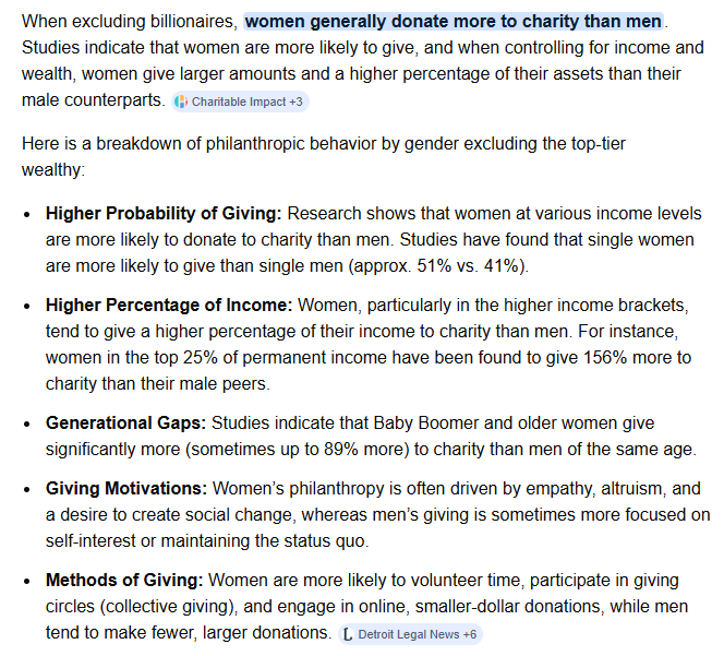 >>84405479They give their husbands' money to charity, or money from a job they only got because of affirmative action that put in place by deceived and horribly misguided men. Either way your image proves men and only men engage in charity. This becomes more obvious in the field. Missionaries going door to door are overwhelmingly men. Missionaries building houses, again overwhelmingly men. Disaster relief after Katrina, you guessed it: overwhelmingly men.Women can only hate, stir division, and cause strife. When you do see women in charity it's always the bogus charitable organizations with a thousand committees, chairs, offices, etc. that take 90% of funds raised and gives it to themselves as employees of a non-profit. That's not charity, that's a scam. Actively stealing from the poor by misappropriation of resources that were given under the belief that it would help the unfortunate. Instead it is just spiteful fat roasties taking money from people and filling office chairs with farts.