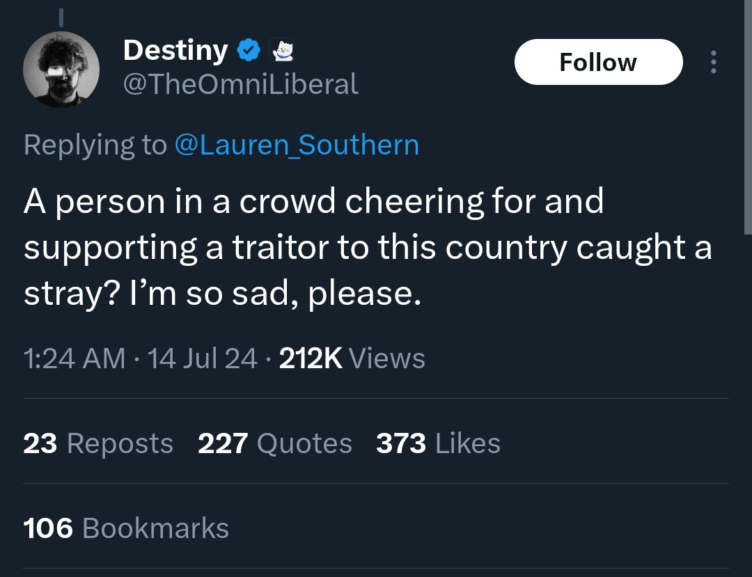 >>84408543I do wish Trump hadn't said that, but I saw many conservative commentators who were horrified by his comments and said they were disgusting. Robbie Starbuck just off the top of my head. Then again, if somebody dedicated years to trying to put me in prison I'd probably be happy they died too. I think the Pretti thing was unfortunate, but if you've got huge groups of people antagonizing the officers, blowing rape whistles to make it hard for them to communicate and to make them as nervous and on edge as possible, they're not going to handle every situation perfectly.