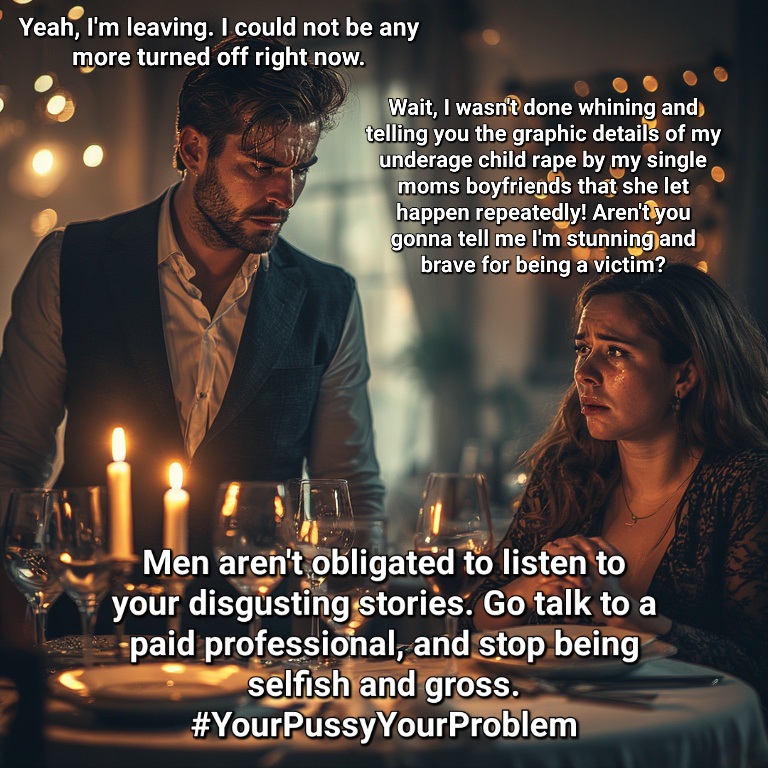 >>84409722Your rape is not our problem. Stop trauma dumping and pay someone to listen to your disgusting problems.Rape is gross and so are you>Your pussy your problem