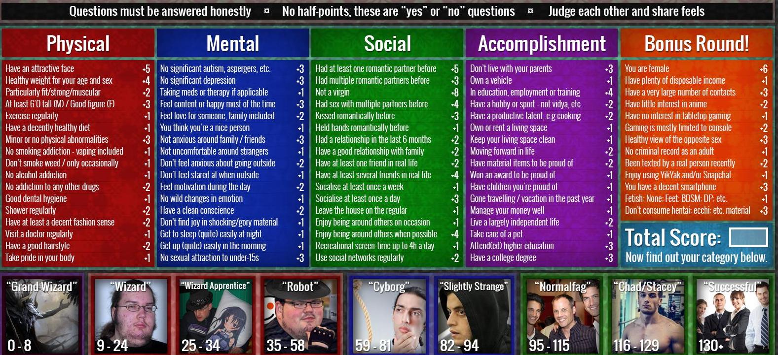 >>84428340Kek.>>84428371I'm not the one who made it but in my experience it's the best test that has ever crossed this board and takes into account much more things which other tests ignore/give a superficial attention.>>84428397I've never been banned from 4chan when I was underage, if I needed to say my age to interact in a thread like a data mining one, I would just say I was 21 because late teens (18-19) would be too suspicious. Nowadays I hate and report underages who post here too (it's surprising how there are people who literally post about being in highschool and don't get banned, fuck jannies).>>84428412Even when I was straightedge and used to hang out with friends, I would still at least get cyborg in the results.
