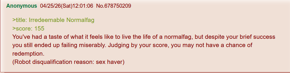 >>84428158I've been posting on 4chan for 3 years and some months now, since I was 15 (now I'm 19, but I started lurking on r9k when I was still 14). I feel like it was yesterday that I began posting here, I used to screenshot almost every interesting thread I saw in the beginning because I thought they were unique, kek. I will never forget how it took me like 10min to realize that I was able to move the horizontal scroll-bar below the CAPTCHA's pic. Now I'm a fullfledged robot, dunno if that's a good thing, though.>>84428202Shit test. This one from the Robot General is way better https://robot-generals.neocities.org