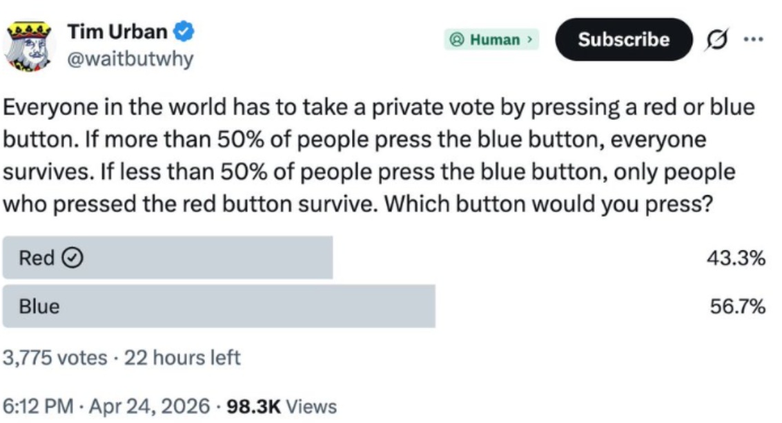 Red button has no downside. Everyone who presses it survives and there's no cost to press it. Blue button also has no cost to press it, but big downside. If less than 50% of people select blue then pressing blue kills you/everyone who selected blue. Blue is basically playing Russian roulette for no reason. Or does it assume that the 22 remaining hours has elapsed, button presses tallied and are accurately displayed, and the person answering the question is the final press? There's no clear indication that this is the case in the image but some in the thread are mentioning the poll results which should be irrelevant unless you specifically know a blue buttoner(s) and are thus incentivized to take the unsafe choice.