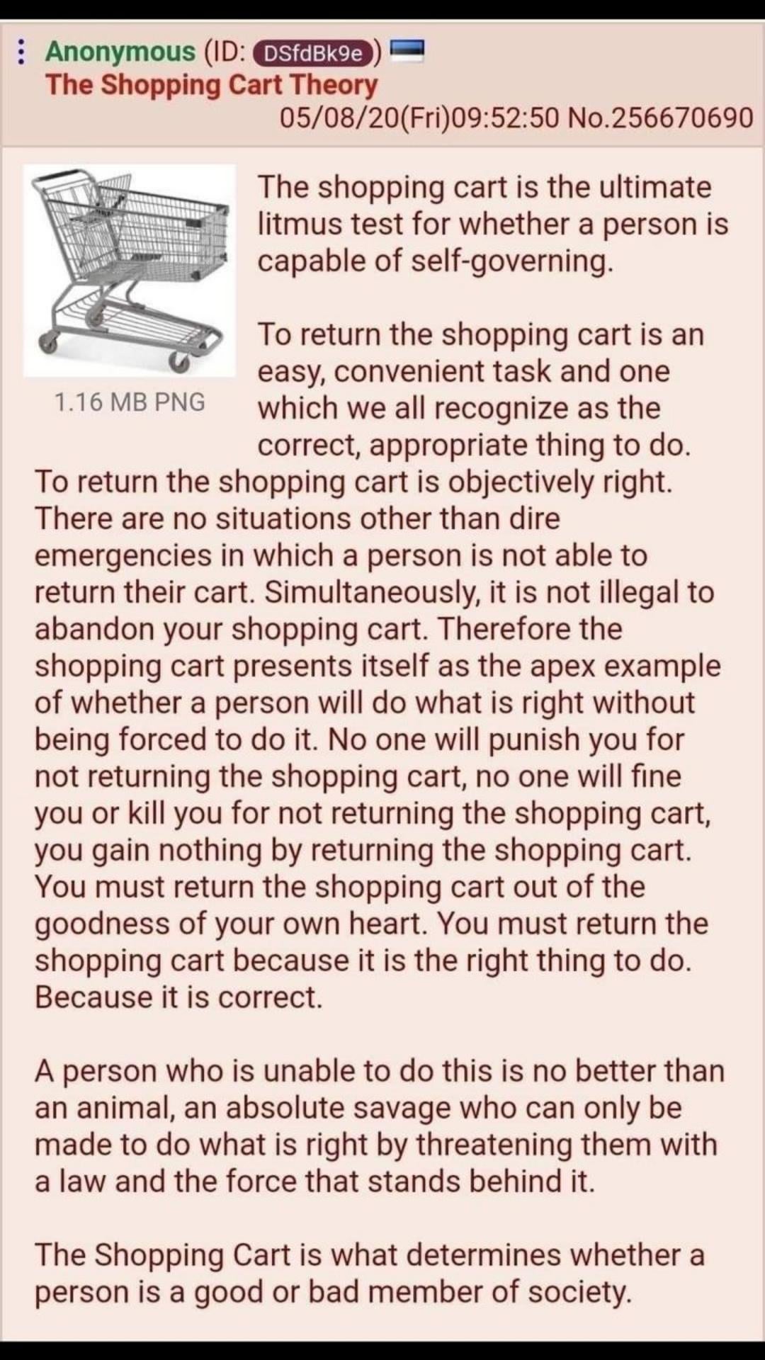 >>84431057>muh game theoryOnce again, humans don't use formal rationalism to make decisions and it totally ignores morality and ethics. By failing to press blue, you're actually just a selfish animal not fit for civilization. This is just a reframed shopping cart return situation, and you failed.
