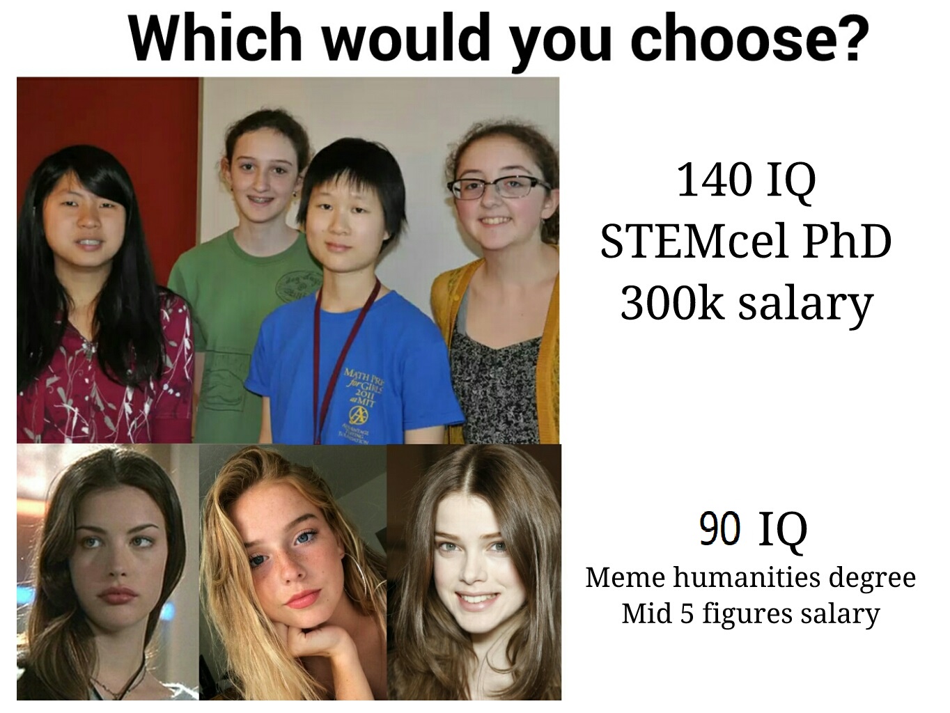 >>84429276I would 100% pick one of the STEMcel girls.>higher earnings mean a more stable life for our kids>high iq means better impulsive control, therefore less likely to cheat>temperamentally, likely to be more similar to me>not ran through by guys out of their leagues, meaning they will be less deluded and wouldn't compare me to them>don't have to act like a normgroid around them, like with the stacy'sIt's hard for me to picture a better life with the 90IQ meme degree stacys that won't end in disaster desu.