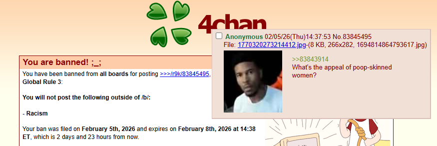 >>84436006you only got that ban bc you pissed off a janny/mod. they don't actually care about racism. i said something criticizing one of the mods/jannies and shortly after they were calling me nigger in a random thread and i said something very mild and not racist and got banned for racism lmao