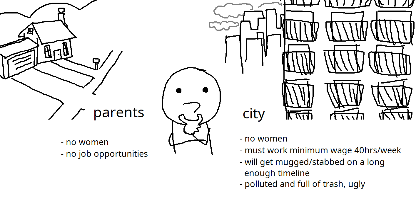 Living with your parents sucks since you have no privacy to bring a girl over, but wageslaving 40 hours a week just to rent a cardboard box, barely afford anything and risk the girl cheating and whoring out behind your back? Nah, I rather live with my parents, I'm either unemployed or working part time so I get a lot more free time at least.
