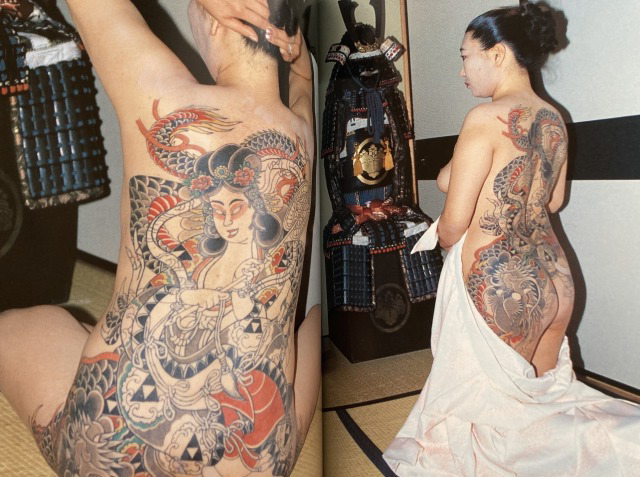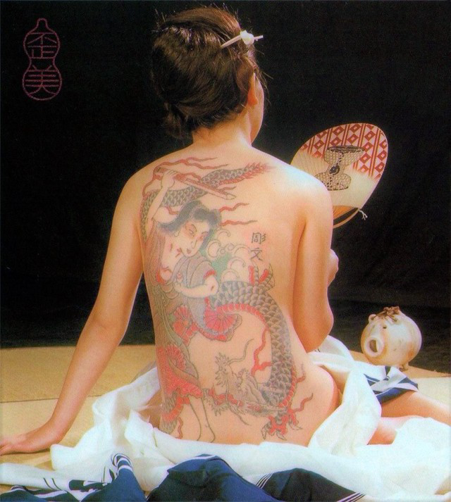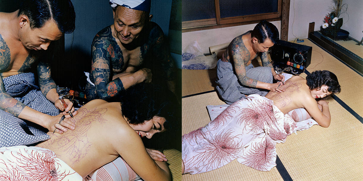 >ywnb a japanese tattoo artist tattooing the design of an oiran or geisha upon the back of a half nude beautiful busty young lass while your elders gather around to watch in 1955 nippon>ywnb tokumitsu uchida