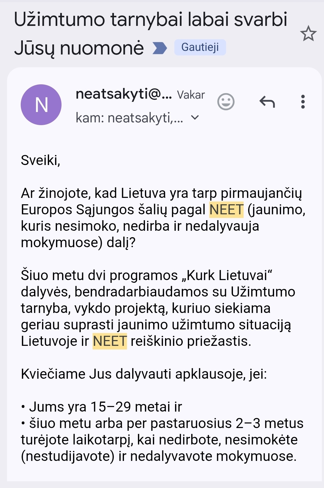 >>84448598>You can get translation yourself i don't fucking care.yes, from a machine:The Employment Service really values your opinionHello,Did you know that Lithuania is among the leading European Union countries in terms of the share of NEET (young people who are not in education, employment, or training)?Currently, two participants of the Create for Lithuania program, in cooperation with the Employment Service, are carrying out a project aimed at better understanding the situation of youth employment in Lithuania and the causes of the NEET phenomenon.We invite you to participate in a survey if:you are 1529 years old, andcurrently or within the past 23 years you had a period when you were not working, not studying, and not participating in training.how is that "are you a protagonist in a psychological dramedy about social withdrawal?"