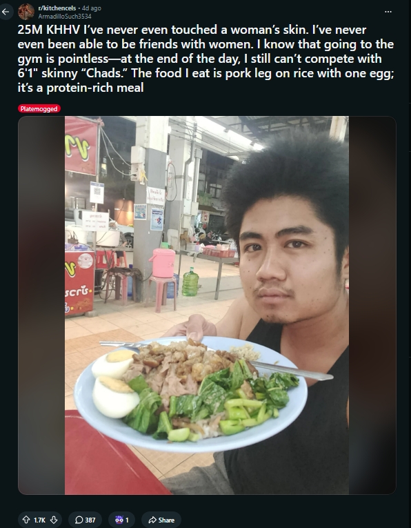 >>84450511kitchencels is a normie comedy subreddit the concept of a man thinking about some sort of existential anxiety while eating bad or average food alone is a really funny premise to normies