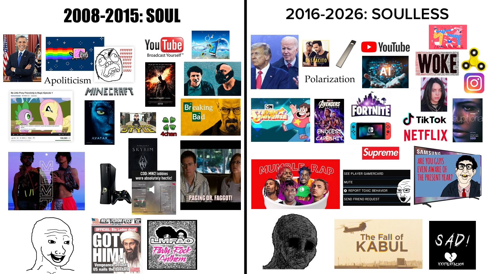 >happy, optimistic vibe>people were still sane and didn't act like retards all the time>internet was still fun>upbeat music, party rocking>wokeshit didn't take off until 2016Just admit it chuds, Trump failed. He was supposed to make things better, but instead they got even more depressing.