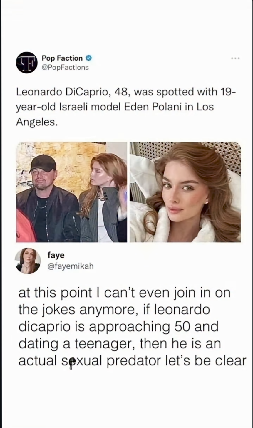 >>84454139It's crazy how much the anti pedophile hysteria was created in just a few decades. In the 90's Jerry Seinfeld was in his 30's dating a 17 year old and no one cared. Now Leonardo Dicaprio and Tobey Maguire are being called predators for dating literal adults.