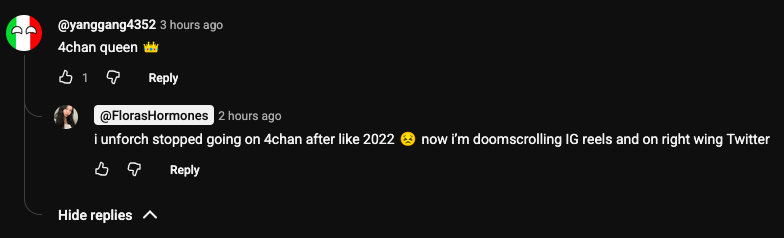 >>84454463didn't even mean this as an ad, I didn't know other people were posting this woman here.here's another foid I saw who felt somewhat 4chan-ish, just the way she uses words like "autistic" and "gooning" and "sigma". but it's not aimed at a 4chan audience, it's just normal