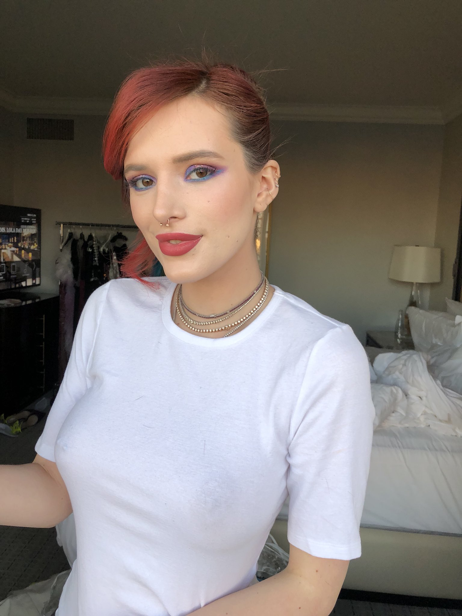 Using her thumbs to pull at her clothing