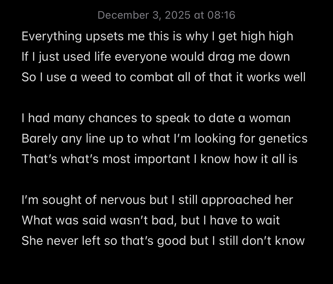 >Dumb poem guy smokes weed big surprise I can see>He never says smart things just lazy ones you'd expect>College freshman or high school thing I don't know>Always three lines never know about meter or stress>Maybe stressed in life, mid IQ standards too high>12 hours a day on iPhone notes it's what he does>For fun maybe thinks he's not trying to be great>Just share and create you know that kind of cope >But what he never answers is who do you quote?