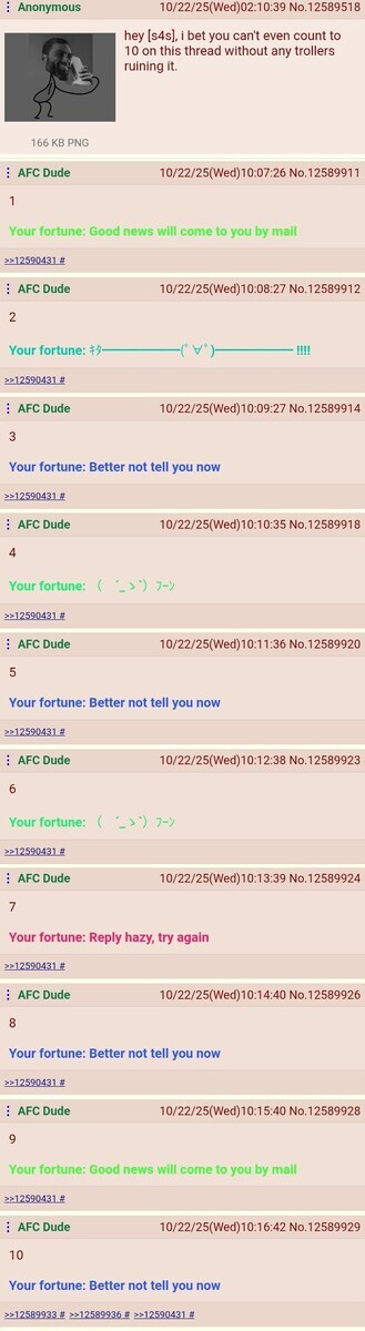 >>12590597Because I counted to 10 uninterrupted, obviously...>>12590666...nice trips btw, Satan star-chanYour fortune: Outlook good