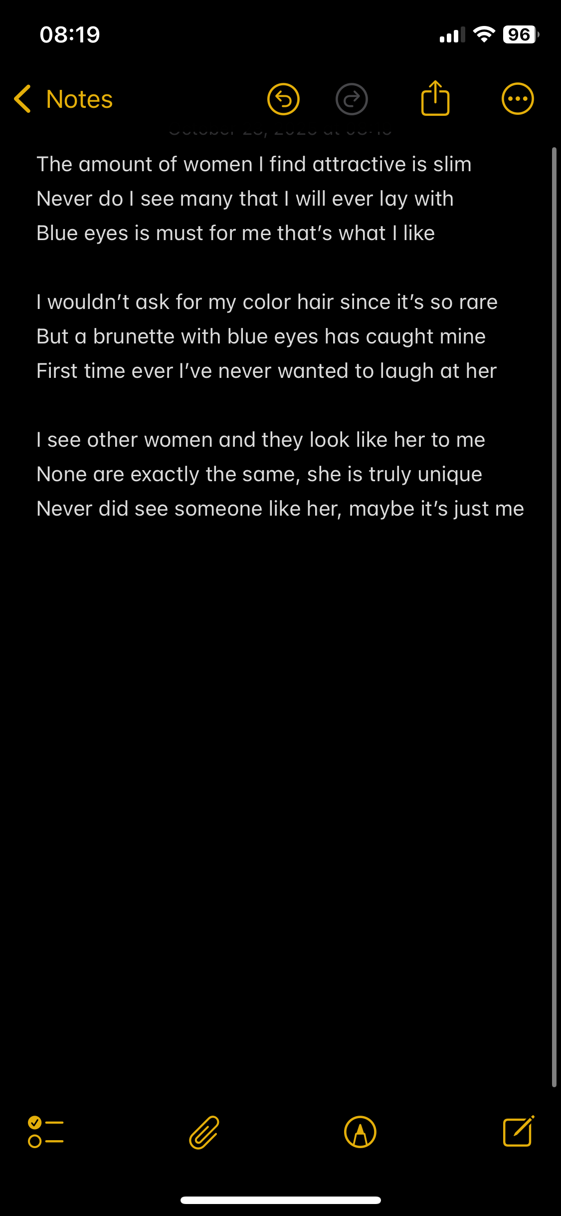 >The amount of women I find attractive is slim >Never do I see many that I will ever lay with >Blue eyes is must for me that’s what I like >I wouldn’t ask for my color hair since it’s so rare >But a brunette with blue eyes has caught mine >First time ever I’ve never wanted to laugh at her >I see other women and they look like her to me None are exactly the same, she is >truly unique >Never did see someone like her, maybe it’s just me