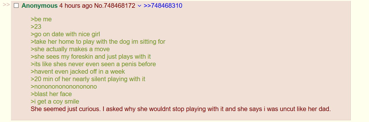 >>12653819sorry for your loss i dont mean to be rude by typing this it is just the thought that popped in my head but i think people with circumsized penib lack some pleasure in there life basically you will never achive the level of pleasure what people with foreskins have just because your parents were beliveing what the doctor said or what is the most common procedure in the region you were born is or whatever becasue you are physical incapable if you would compare yourself with other humans but you cant feel other humans feel you can only relate to that because you might felt the same but that brings in the question did you feel the same as the other person like you precive the same colors inb4 color paradox idk where im going with this basically the only reference point is yourself and your observings, man i wish my parents did not neglected me kek