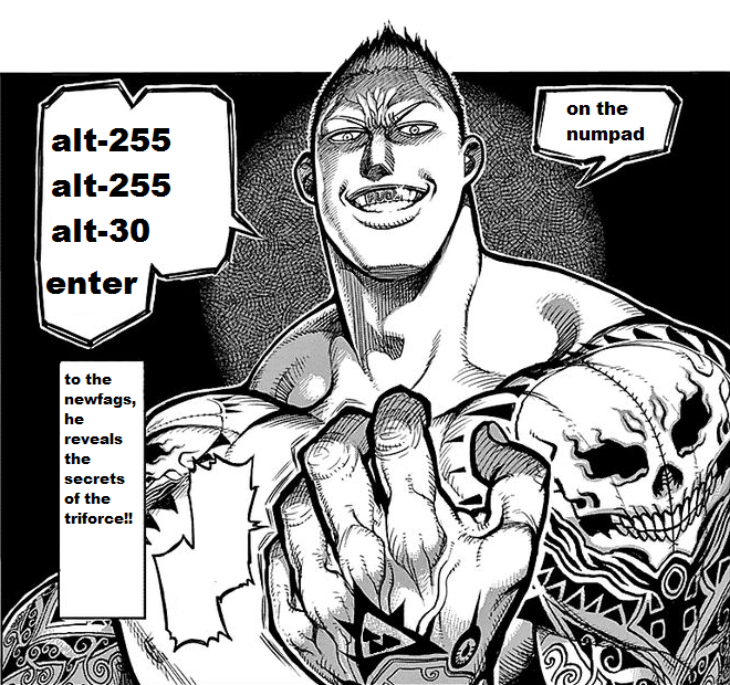 >>12698746Apparently 4chan doesn't allow a Japanese full space (which is how you do it), so i guess triforcing on 4chan is now impossible