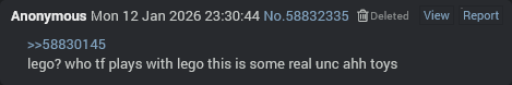 >>12730135They were talking about the new pokemon lego set and I said lego is a toy for uncs.