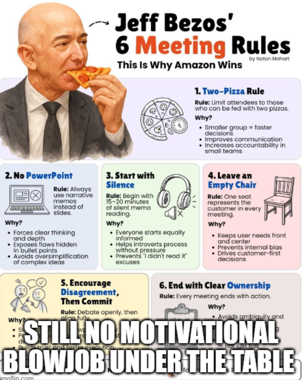 Apparently the 2 pizza rule is just a stupid way of saying "no more than 12 people" and they don't serve pizza at Amazon meetings AT ALL. He really is a villain.